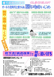 いま、橋下知事は府民のみなさんからの高い支持率を得ていますが、果たして府民の願いは実現されているのでしょうか。橋下流「構造改革」ともいえる「府財政構造改革プラン」は、財政難でも財界・大企業はしっかりサポートし、府民や府職員には痛みを押しつける内容となっています。ビラを作成しましたので、ぜひお読み下さい。