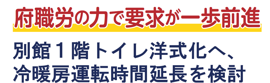 この間、府職労が職員のみなさんの声を集め、強く要求していたトイレの洋式化について、一歩前進です。「まずモデルケースとして別館1階トイレの和便器(男女とも)を洋便器へと改修する」と説明がありました。すでに10月26日からは工事も始まっています。引き続き、別館の他のフロアも含めてトイレの洋式化、女性トイレの増設等を求めて取り組みます。