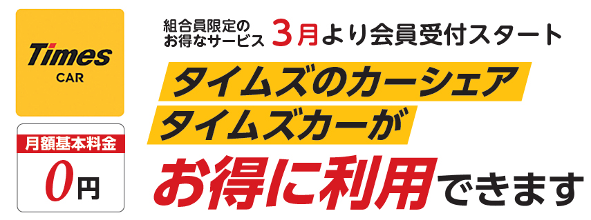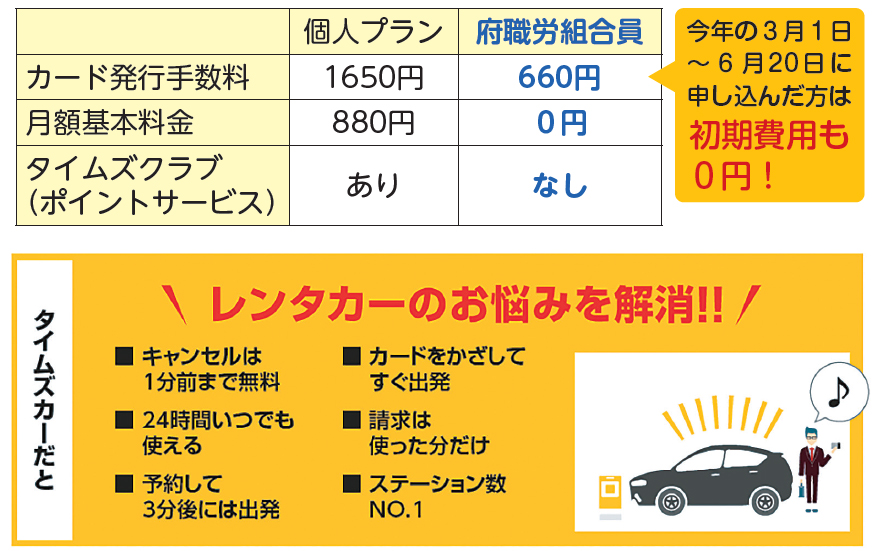 会員数、ステーション数、車の台数、№1のタイムズカーがお得に利用できます。府職労組合員は月額880円の基本料金がずっと0円。そしてサービス開始を記念して、6月20日まで申込みの方はカード発行手数料1650円も無料に!コストをかけずに、いつでも手軽にレンタカーが利用できます。